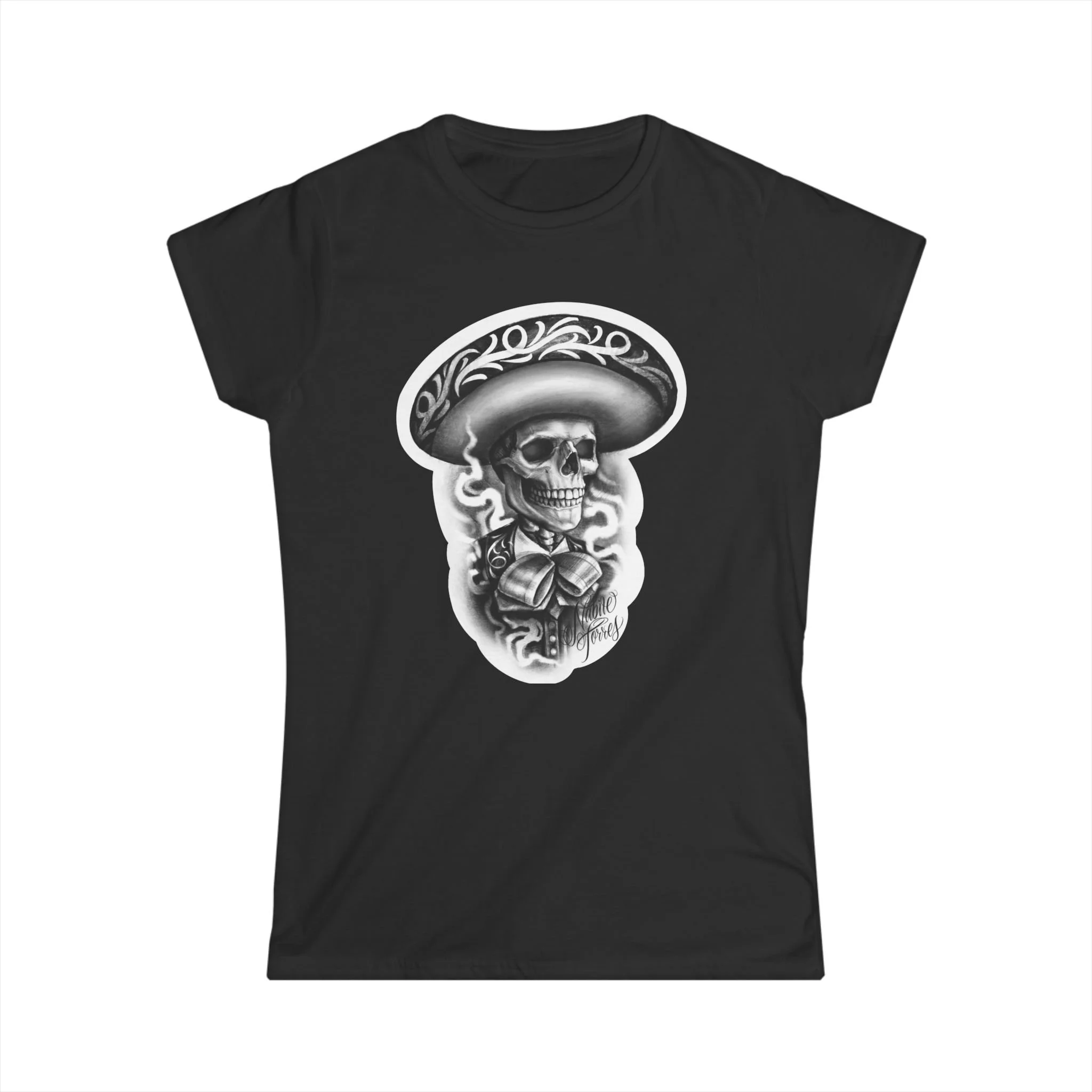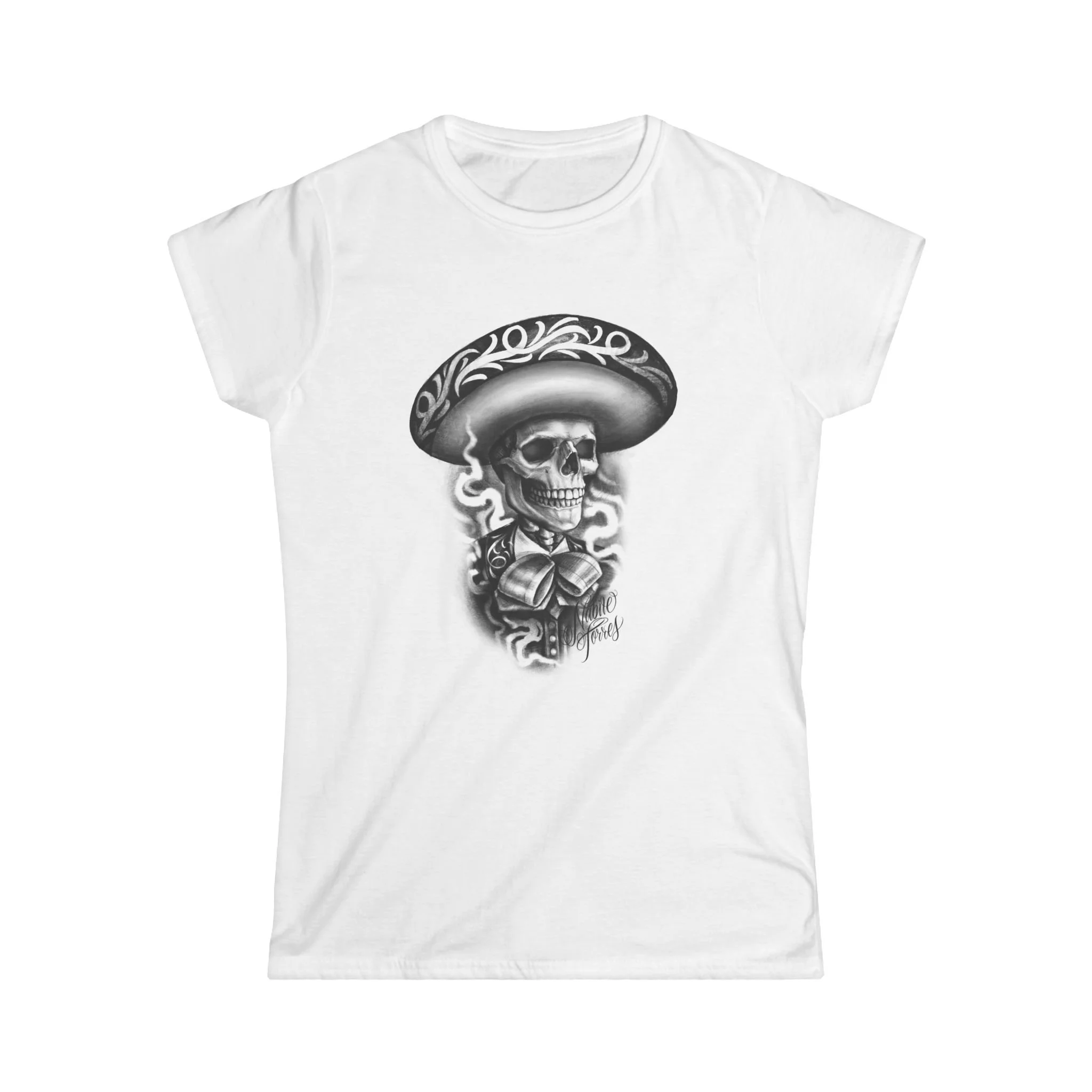 This slim, semi-fitted tee brings a bold, artful edge to everyday wear. The front features a detailed monochrome skull illustration wearing a wide-brimmed, patterned sombrero—an ink-style design that reads like tattoo art. Lightweight ringspun cotton drapes softly while the ribbed collar and shoulder tape keep the silhouette structured after many wears. Wear it tucked into high-waist jeans for an evening out, layered under a denim jacket for a concert, or with relaxed shorts while wandering street markets. The shirt feels lived-in from the first wear and shows off personality without shouting—quietly rebellious, art-forward, and unmistakably expressive.