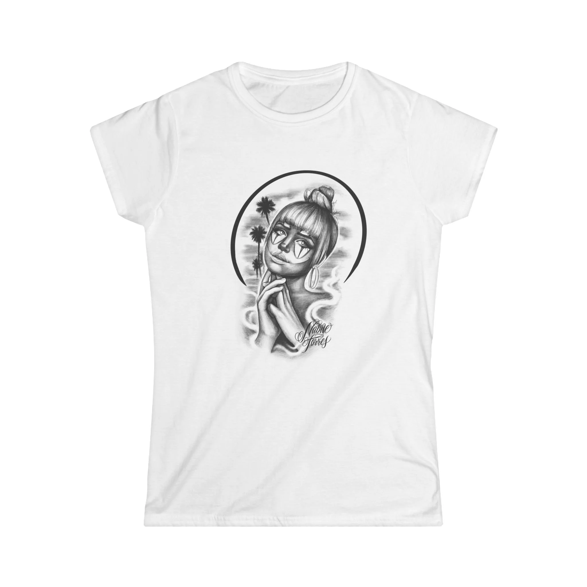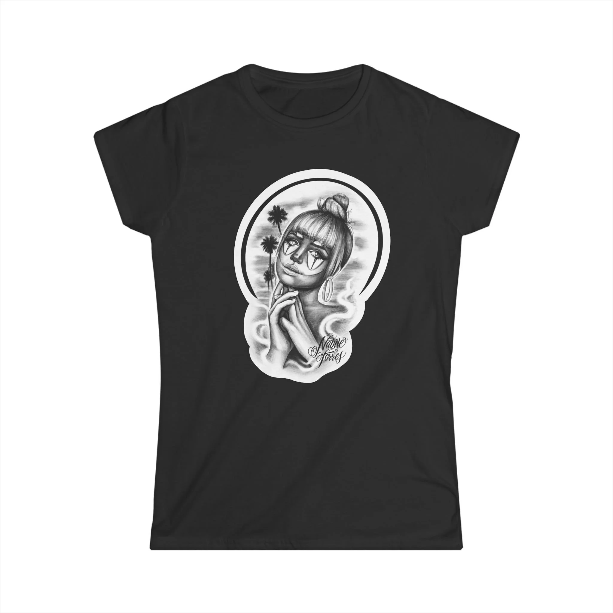 Soft, lightweight tee with a hand-drawn, grayscale portrait that feels both nostalgic and cool. The illustration centers a thoughtful, retro-chic woman framed by palm silhouettes and drifting smoke-like accents — an artful mix of lowrider tattoo style and sunny, coastal evening vibes. The semi-fitted cut and tear-away label keep the shirt comfortable and wearable all day, while the faithful print placement makes the design read like a personal statement worn close to the heart. Slip it on for casual strolls, late-night drives, or when you want a quiet piece of art with your outfit.